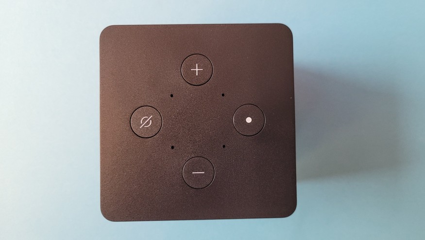 Auf der Oberseite gibt es Tasten zur Lautstärkeregulierung und Ein-/Ausschalter für die Set-Top-Box und für den Sprachdienst. An der Vorderseite signalisiert eine LED-Leiste am oberen Rand, ob Alexa aktiv ist.