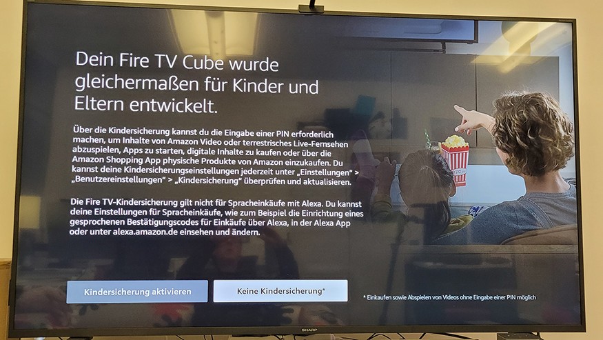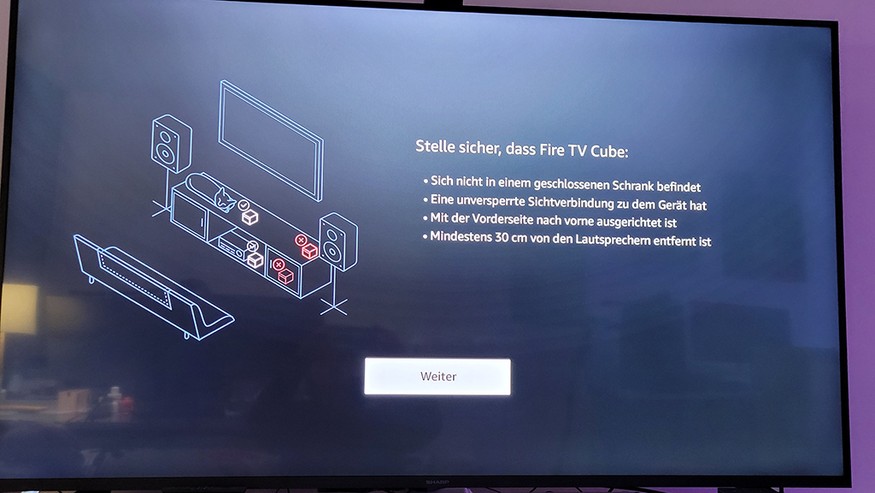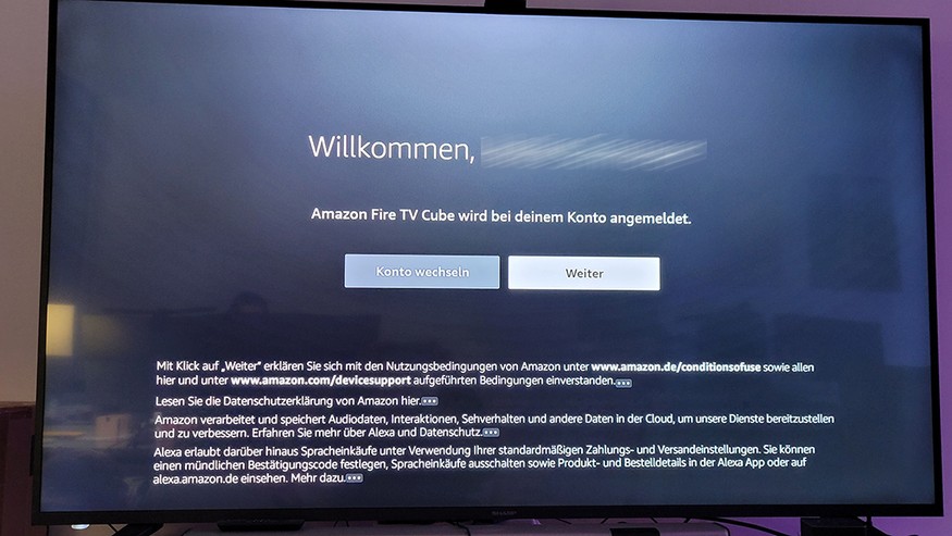 Das Setup ist einfach und nach wenigen Minuten abgeschlossen. Hierfür verbindet man die Streaming-Box über ein HDMI-Kabel mit dem Fernseher. Im Test hat der Anschluss auch über eine One-Connect-Box von Samsung einwandfrei funktioniert. Ein HDMI-Kabel (Ratgeber) ist im Lieferumfang leider nicht enthalten. Nach dem Anschluss der Stromversorgung meldet sich nach etwa 30 Sekunden der Installationsassistent, der durch das weitere Setup führt. Zunächst wird die mitgelieferte Fernbedienung durch ein zehnsekündiges Drücken der Home-Taste mit dem Fire TV Cube verbunden. Anschließend stellt man die Sprache ein und verbindet die Box, falls sie nicht über ein Ethernet-Kabel mit dem Router verbunden ist, über ein WLAN-Netz mit diesem. Jetzt aktualisiert sich das Gerät auf die neueste Firmware und fordert zur Anmeldung auf. Wer noch kein Amazon-Konto hat, kann dies während des Setups anlegen (siehe auch Bildergalerie).