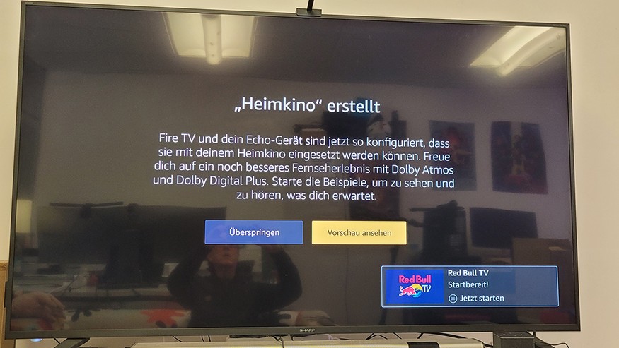 Nach der Basis-Einrichtung informiert der Installationsassistent über die Möglichkeit, vorhandene Echo-Geräte für ein Alexa-Heimkino zu konfigurieren. Dafür kommen maximal zwei Echo-Lautsprecher wie Echo Studio und ein Subwoofer infrage. Im Test hat die Koppelung mit Echo Studio einwandfrei funktioniert.