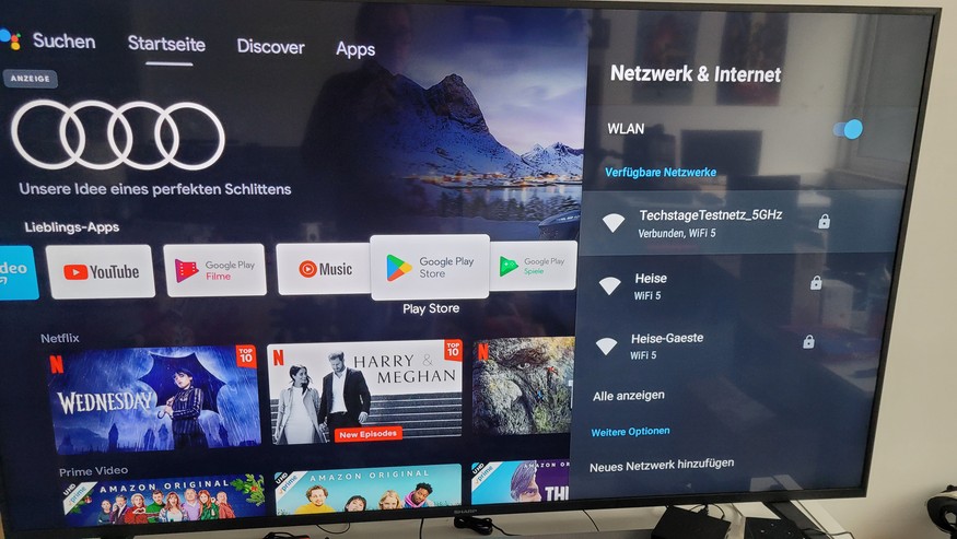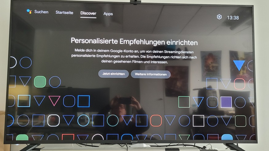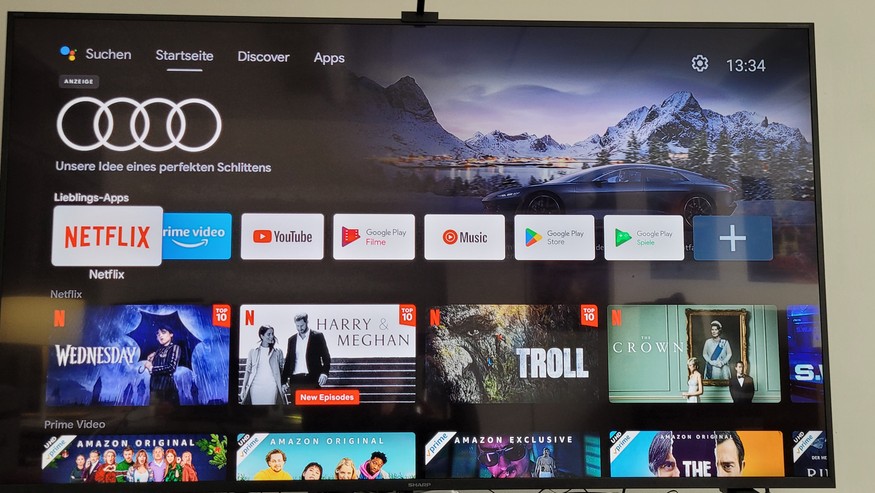 Die oberste Leiste im Startmenü gliedert sich in Suche, Startseite, Discover und Apps. Darunter erfolgt ein Werbeplatz, der entweder eine Anzeige oder Programmhinweise präsentiert. Anschließend werden die Lieblings-Apps angezeigt. Hier können Anwender ihre favorisierten Apps einstellen und auch sortieren. Unterhalb der Lieblings-Apps werden Inhalte aus diesen gezeigt. Eine Übersicht über alle von den verschiedenen Mediathek-Apps bereitgestellten Live-Inhalte gibt es hingegen nicht. Hier muss man also zunächst etwa die ARD-App starten und dann einen Sender wie Das Erste auswählen.