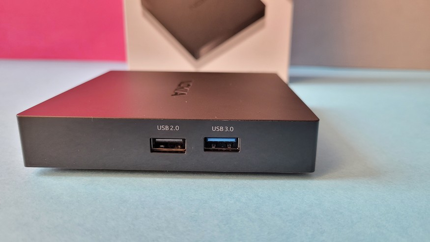Für den Anschluss von externen Festplatten und Spielcontroller stehen zwei USB-A-Anschlüsse (USB2 und USB3) bereit. Ein Audio-System kann über den optischen Digitalausgang mit der Box verbunden werden. Zudem gibt es noch eine USB-C-Buchse, die allerdings nur als Stromanschluss mit maximal 5 Watt nutzbar ist. Damit kann man sein Smartphone laden oder etwa ein USB-Gerät wie eine Überwachungskamera betreiben. Im Test hat das mit der Aqara G3 (Testbericht) einwandfrei funktioniert. Über die Bluetooth-Schnittstelle können Anwender weitere Geräte wie Spielcontroller oder Trackpads anschließen. Letzteres ist dann nützlich, wenn eine App Toucheingaben erfordern und die Fernbedienung (dazu später mehr) dann nicht weiter hilft.