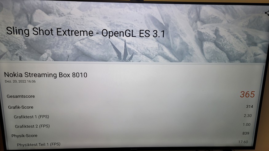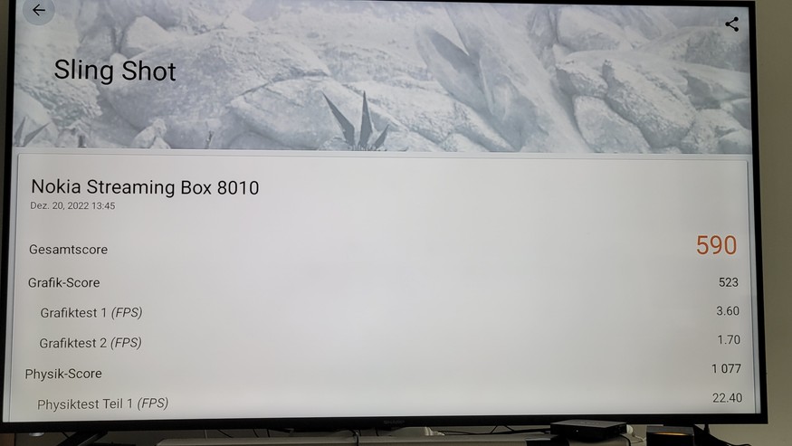 Im Vergleich zur Vorgängerversion bietet der neue Chip mehr Performance, sodass Anwender auf dem Gerät auch 3D-Spiele genießen können. Als Alternative für Hardcore-Gamer ist die Nokia Streaming Box 8010 dennoch nicht geeignet, da sie für anspruchsvolle 3D-Spiele nicht genügend Leistung bietet: Im Sling-Shot-Test des 3D Mark kommt sie auf einen Wert von 590 und ist damit schneller als 16 Prozent aller Geräte. Zum Vergleich: Amazons Fire Cube 2022 erreicht in diesem Test 2626 Punkte und ist damit schneller als 61 Prozent aller Benchmark-Absolventen.